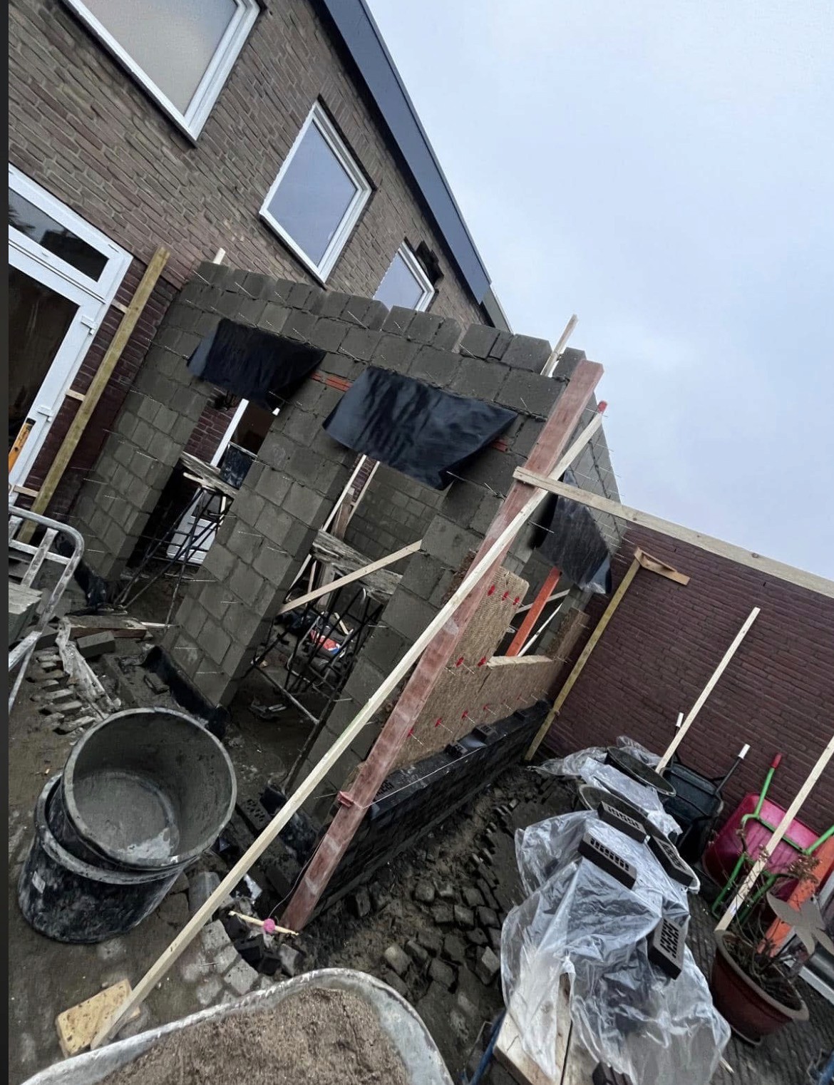 De binnen- en buitenmuren van de aanbouw zijn zorgvuldig gemetseld, met oog voor precisie en uitstraling.