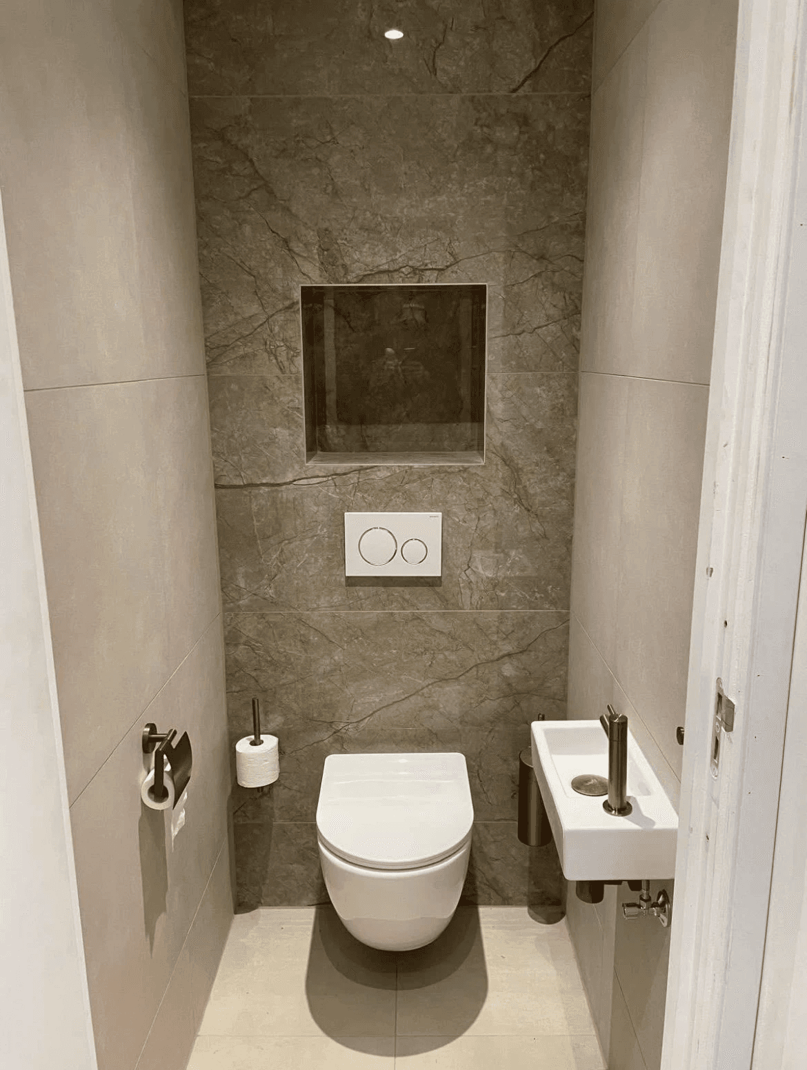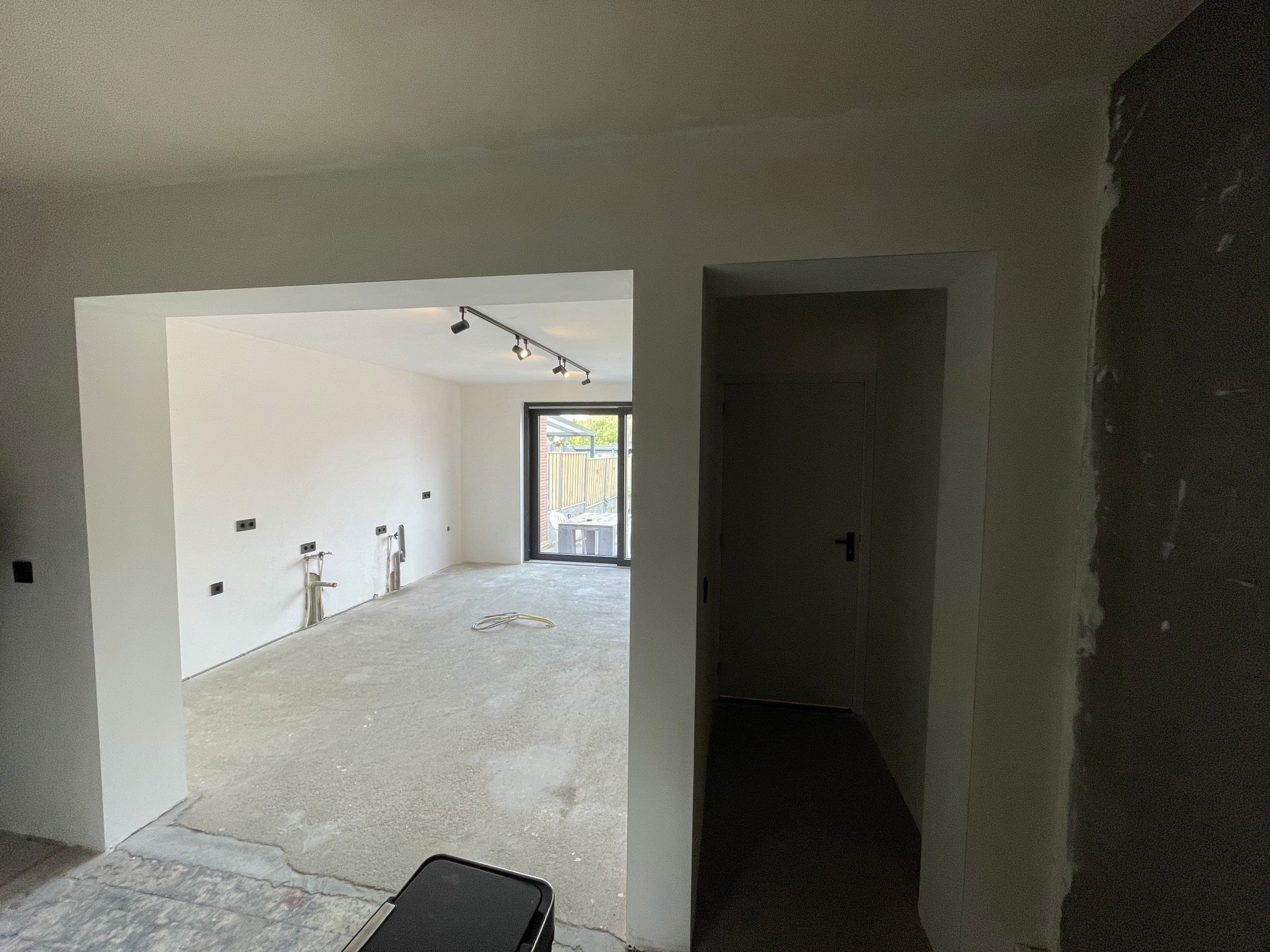 Het toilet is volledig geïnstalleerd en afgewerkt. Daarnaast is de ruimte bouwkundig voorbereid voor de plaatsing van een nieuwe keuken.